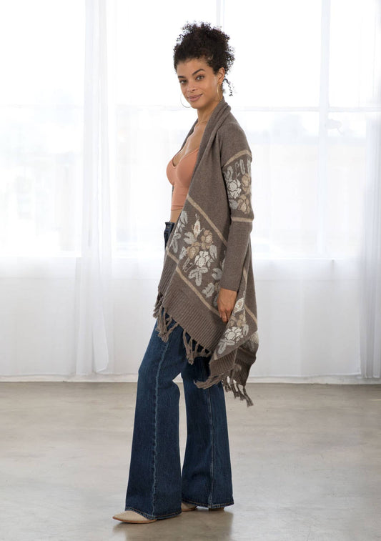 Western Floral Knit Fringe Trim Cardigan