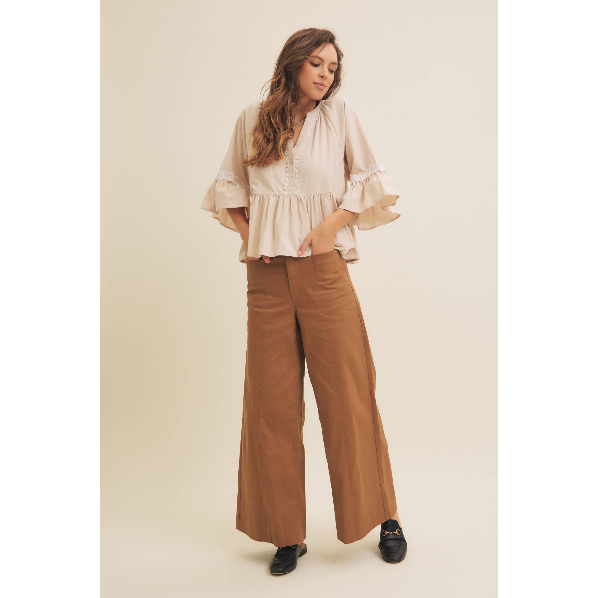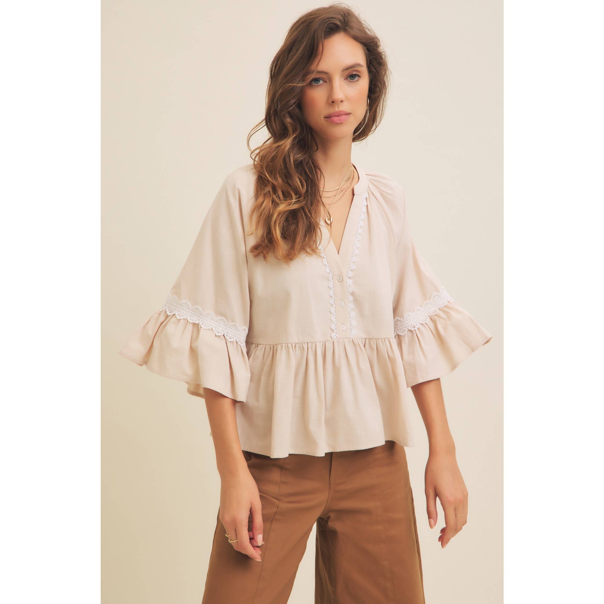 BABYDOLL PEPLUM TOP WITH FLOUNCE SLEEVES AND DELICATE TRIMS